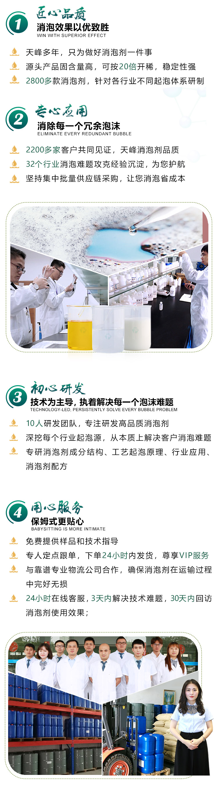 天峰消泡劑依托強大的研發能力和消泡劑行業應用技術,從消泡劑成分結構的研究出發,到